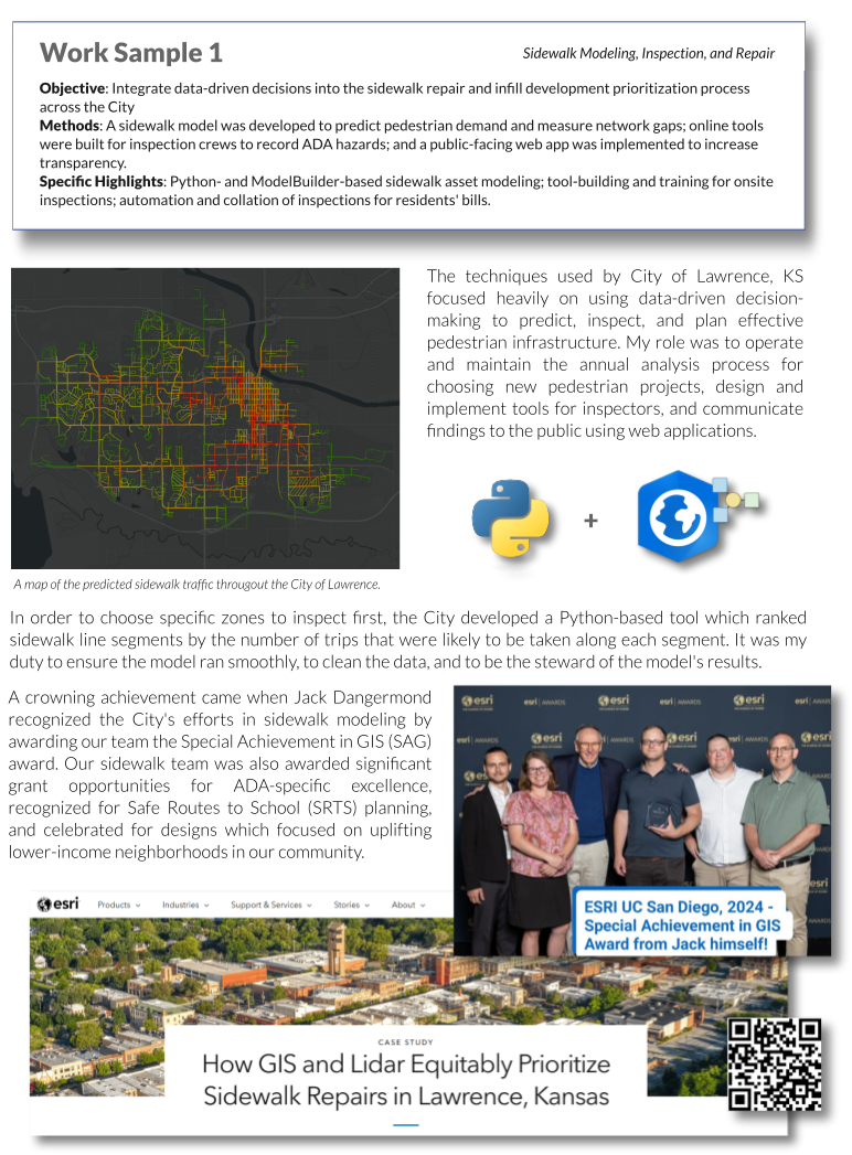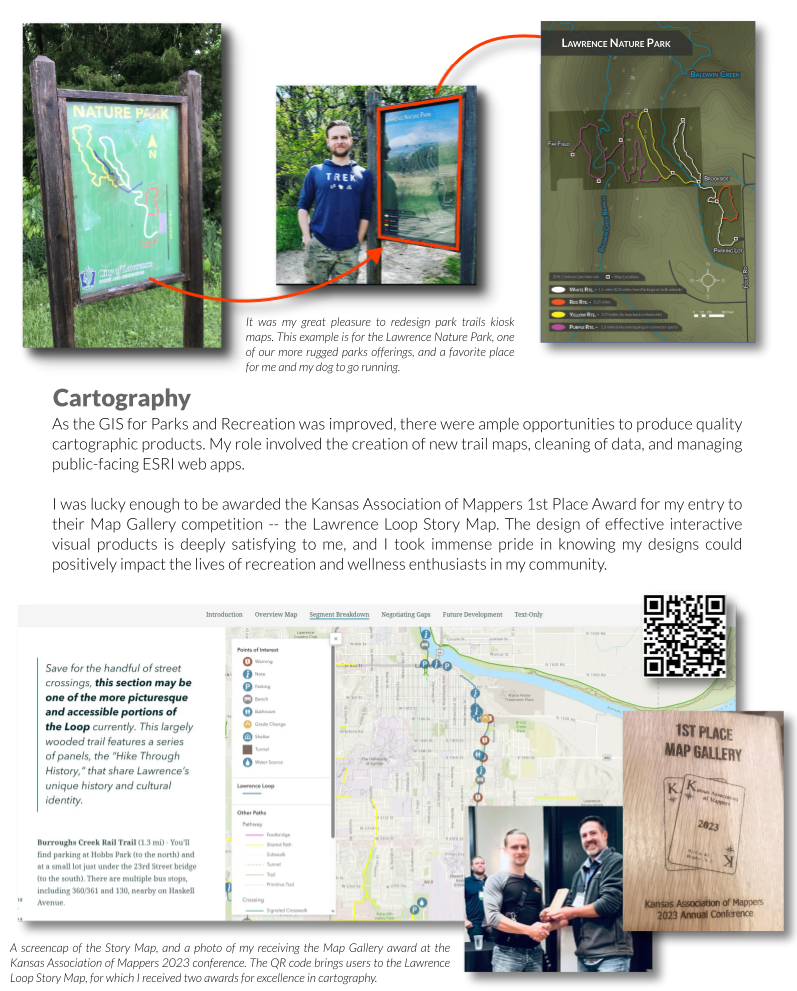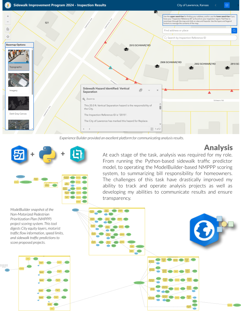 As a GIS Analyst with City of Lawrence, Kansas, I assisted in the development of a modern municipal asset management system. This configuration utilized ESRI and Trimble data platforms including E-Builder, CityWorks, ESRI Enterprise, and ESRI Field Maps.